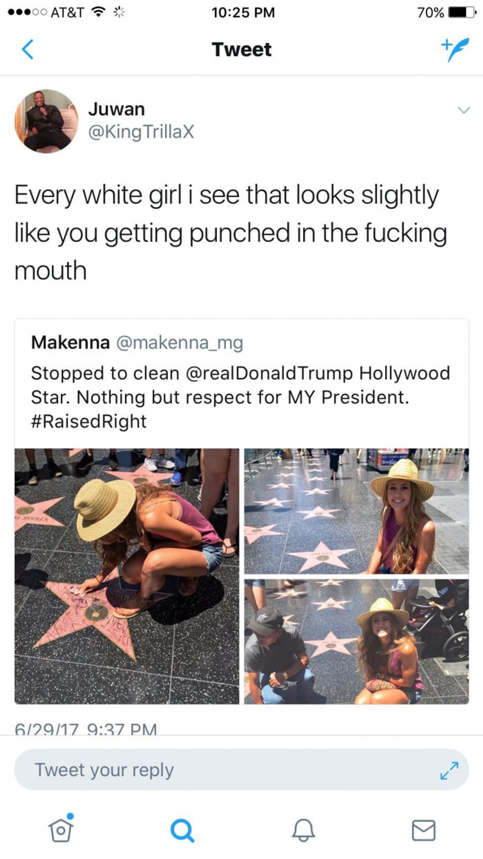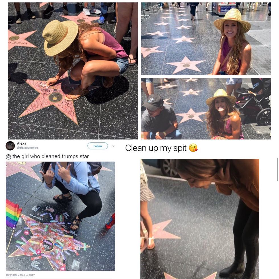 What garnered even more traction was the response of another girl after her. She tweeted a picture of the star now disgraced once again, with the caption "@ the girl who cleaned Trump's star." She is also pictured laughing while holding up two middle fingers. Another taunted her by asking if she would clean up her spit too.