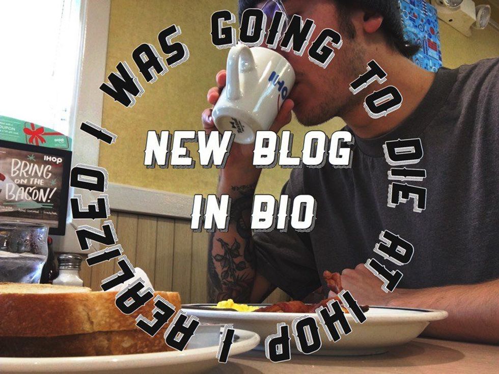I realized at IHOP I was going to die. I don't know if it was the people next to me on their way to a funeral or the non-surprising amounts of old people around me — probably the combination. Either way, it scared the shit out of me. I watched the elderly couple in front of me struggle to order their food and another couple slowly helping each other to their seats. I guess I’ve always known I was going to die. However, there are plenty of distractions in my life that direct my attention away from that fact. It usually isn’t until a funeral, a really moving film or a celebrity death that we start talking about death or thinking about it. Even then I feel we don’t really come to grips with the fact of our impending doom.