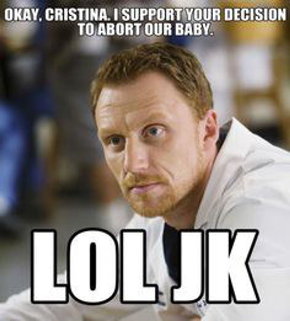 Cristina's whole personality is focused and driven. It's clear from the first episode she isn't interested in raising a family and being a housewife. Owen keeps expecting her to change her mind and pop out 2.5 kids. When Yang unexpectedly gets pregnant, she uses her legal right to have an abortion. Owen gets all mad at first, but then accepts it. Then all of a sudden he's over being supportive and can't be with her unless she births his hideous ginger babies.