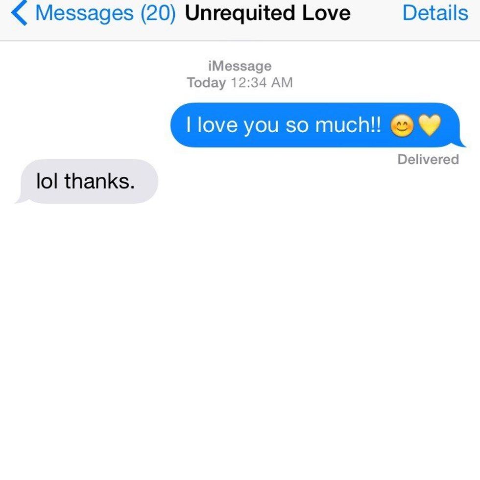 Also, comparing yourself to others that your unrequited love finds attractive is one of the unhealthiest things you can do to yourself. "Maybe if I looked like that person, they would like me" is one of the most disgusting ideas one can make themselves believe. There is no one like you in this universe. You are special and one-of-a-kind. Never have anyone cause you to believe or feel any differently.