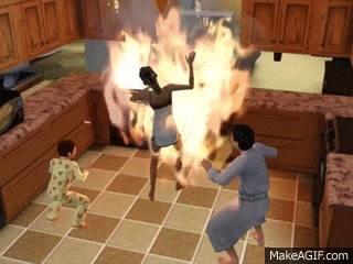 Fires are bad: The Sims taught me that. Putting a rug by a fireplace was a no-no, and, evidently, the same applies if you switched fireplace with stove, and rug with me. Also, fires are fucking terrifying. Perhaps it’s because we’re facing physics and nature at its true full force--something we submit ourselves to as human beings. We are so used to be being in control of our environment. A fire is unpredictable, loud, bright and deadly: when you witness one, you realize Sims are frightened because that's reasonable. Thankfully, you grabbed the extinguisher and put it out, and the only thing that failed to survive was the kitchen towels and likely a few microbes.