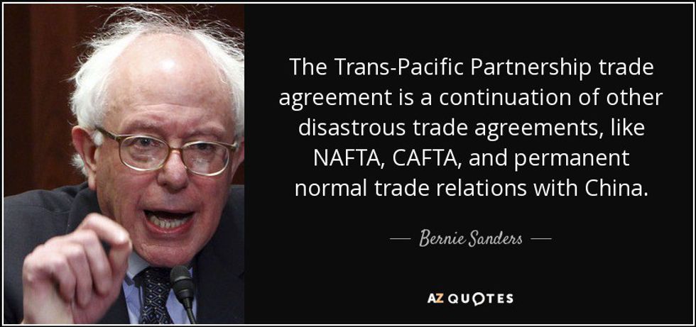 Free trade agreements, such as NAFTA and the Trans-Pacific Partnership, are praised by capitalist theorists because they allow economic growth without government interference. However, economic liberals (especially socialists like Bernie Sanders) believe that free trade destroys jobs, degrades workers and harms the environment. Sanders, in line with this ideology, calls NAFTA a “scheme” that allows huge corporations to “exploit desperate third world workers." Donald Trump joins Sanders on this side of the argument, calling NAFTA a “disaster” in one interview with CNN. Trump is not wholly against free trade, though; he says in that interview, “I’m a free trader…but [NAFTA is not effective because] we use political hacks and diplomats." So while their specific ideas for policy differ, both Sanders and Trump have your back if you want to reform or get rid of NAFTA.