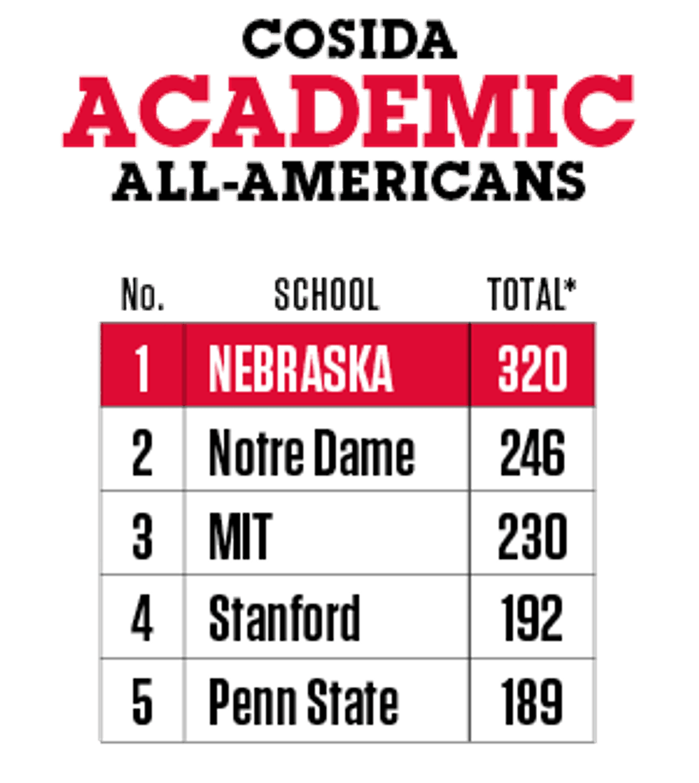 Combining all athletes at Nebraska, the Huskers have the largest number of Academic All Americans with 320 student athletes. This is what helped punch our bowl tickets last season. They got the smarts.
