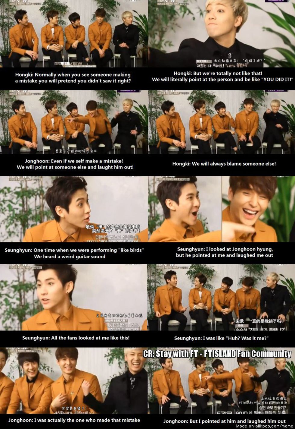 Everything that each member does on a track--including the scream in "Pray," the song I linked to earlier--is done completely live. No lip-syncing. It's a nice break from American artists, who often lip-synch at concerts and may not even be capable of hitting notes that are recorded (autotuned) on their albums. Every performance that F.T. Island does is live unless they are appearing on a show that literally can't accommodate a live performance. That means you can tell when they make mistakes (which in my opinion increases the quality of the experience), so they blame each other.