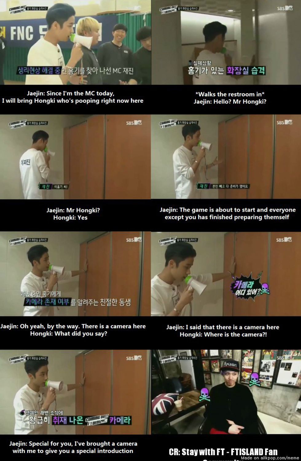 In this specific instance, Hongki's stomach was hurting so he went to the bathroom, but the rest of F.T. Island and the film crew were waiting on him to start filming a show, so Jaejin took it upon himself to bring a cameraman into the bathroom and talk to Hongki through a megaphone.