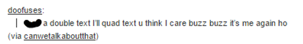 If you're in a more long-term relationship, you know the worry about a double text doesn't exist anymore. Probably my favorite Tumblr post about it because it's right, you think I care? This boy has seen the worst of me and surely isn't going to care if I text him 20 times. In fact, it's one of my favorite things to have not been with my phone and see he's texted me several times about different random things.