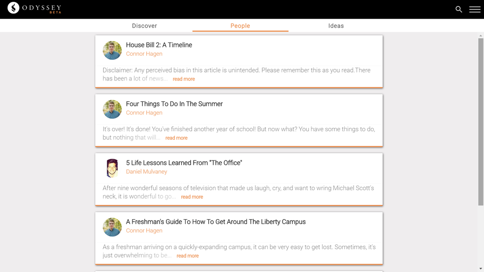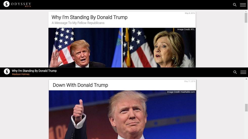 The above screenshots are from the exact same page. The top half is the beginning of the actual article, while the bottom half is at the very beginning of the "suggested articles" section directly after the article itself. The two articles are about the same topic, but from different perspectives. Instead of offering articles that say basically the same thing, Odyssey offered a viewpoint that I might not have considered before. It furthered my thinking on the subject instead of echoing what I had already read. [For the record, these two articles were used for the sake of example. I'm not saying whether I'm for or againstTrump.]