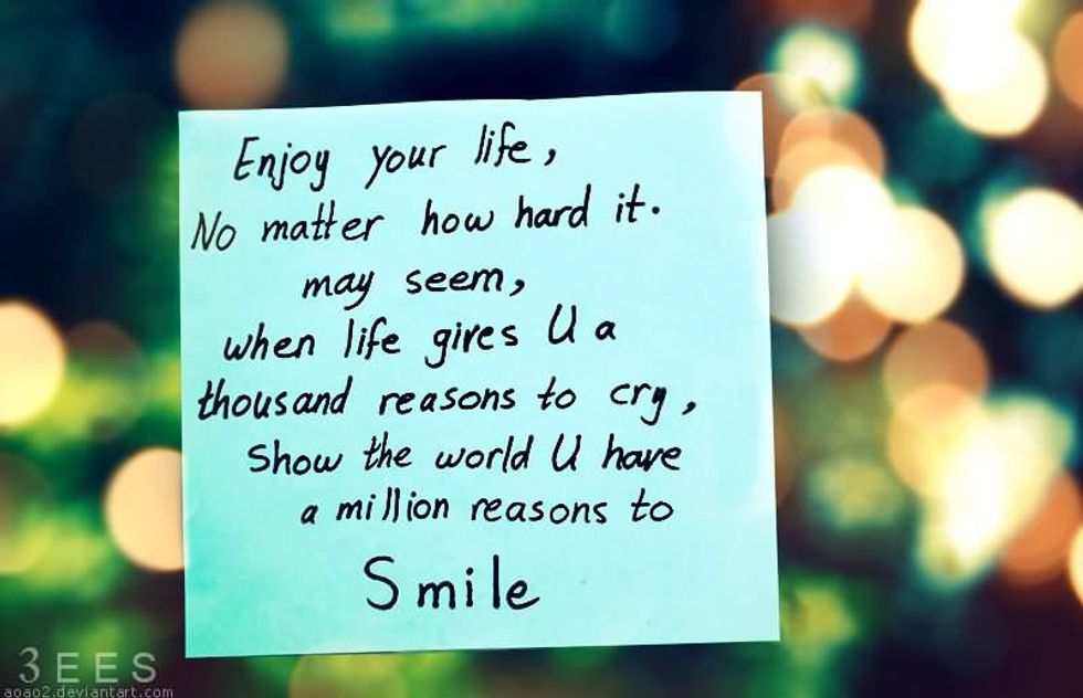 We forget about all the great things life offers us each day. The opportunity to take chances, and never give up on our dreams. This alone gives us a millions reasons why we should live each day to the fullest. We don't often get second chances. We have to take what we have now and just go for it. Never forget the reason you are smiling. We often forget why we smile. Don't ever lose the sense of your own happiness. We get one life to live, so why just sit around not reaching your goals? Find your reason to smile and spread it.