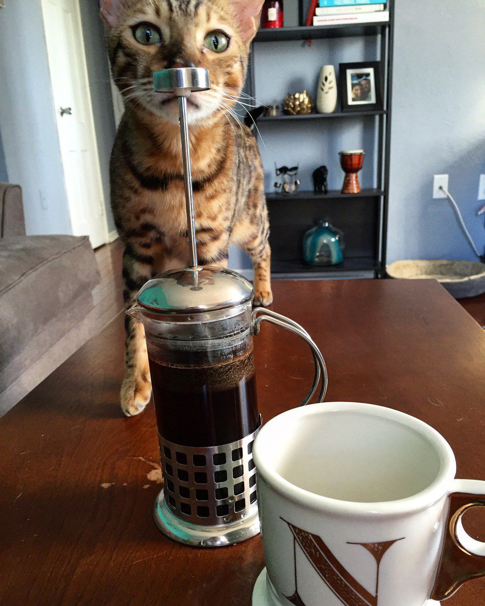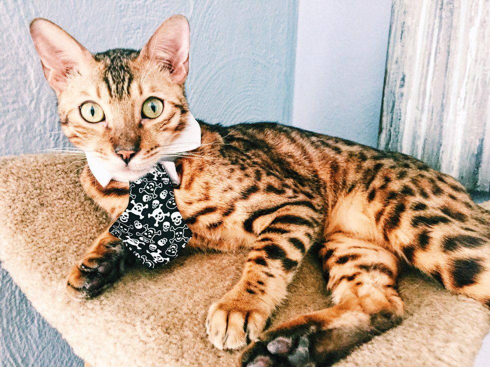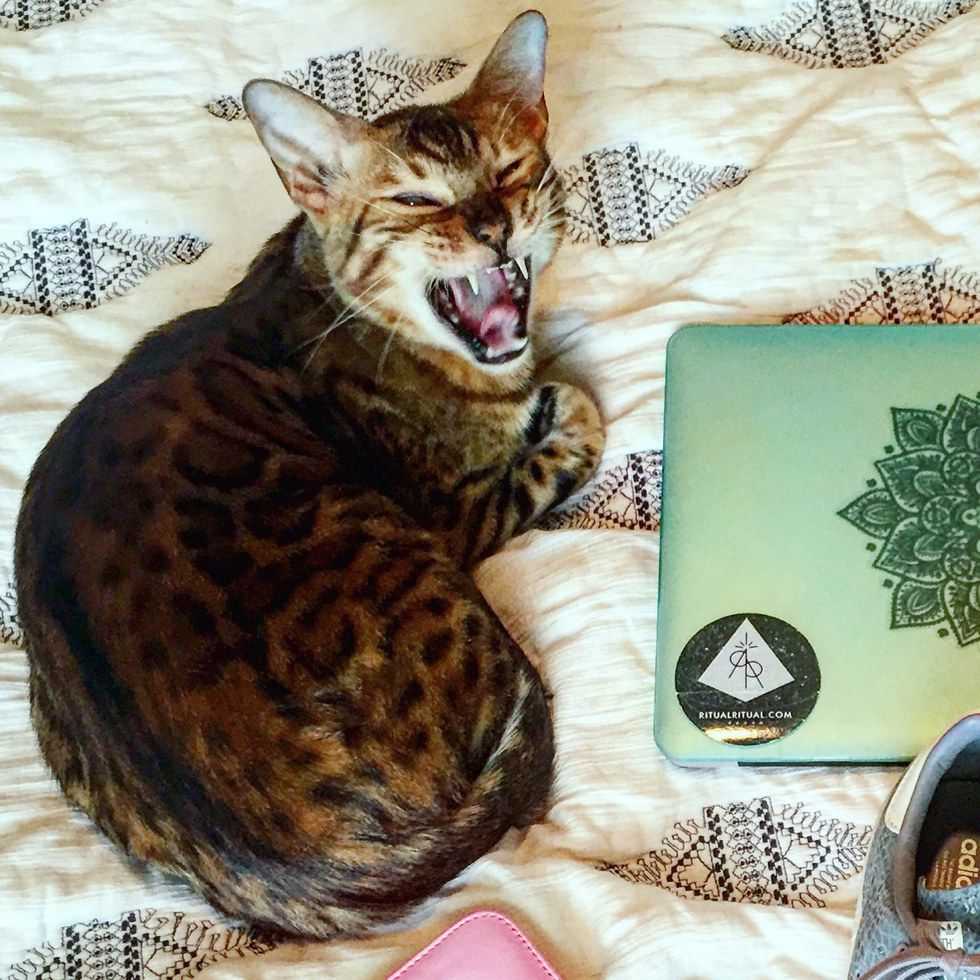 Bengals are kind of like babies, they make noises but you don’t ever really know what they mean. They could be hungry, curious, bored or just begging for attention. Ouija loves to howl and make weird cat noises staring at the wall before trying to scale the walls. Cats love to be high up, and Bengals are no exceptions. Ouija’s favorite spot is balancing on the top ledge of an open door. You can totally have a conversation with your Bengal when you're home, struggling to finish a paper and on your fifth glass of wine.