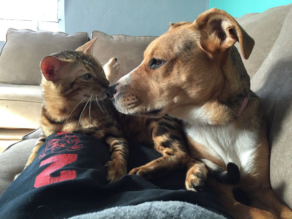 My cat and dog, Luna, have been best friends ever since we got him as a little kitten. They love to play and run around the house and once that’s all over, cuddle up together. They keep each other company while they’re home alone and love to get into trouble (aka the trash can).