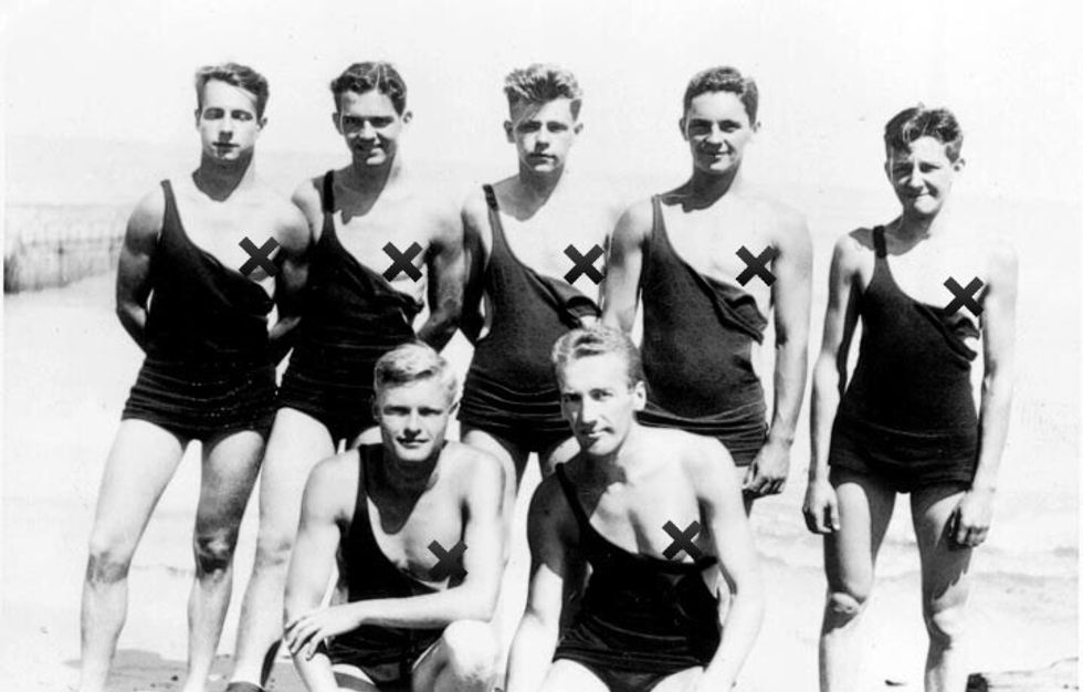 It is little known that it has not always been legal for men to be shirtless in public. Men used to be forced to wear nipple-covering swimsuits at public pools and beaches. Eighty years ago, in 1936, men were granted the right to bare their nipples. Men, much like women today, had to protest the outrageousness of calling their nipples "obscene." The group of protesters below was arrested in 1935 at a beach in Atlantic City for “baring their torsos.”