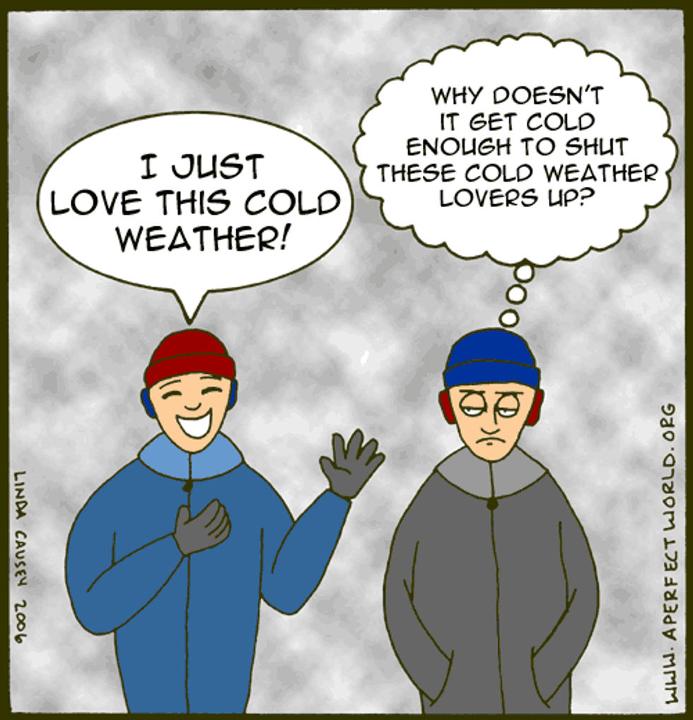 Who doesn't love the cool breeze on their face? Crazy people, that's who. The lower the temperatures, the happier that I am. You can throw open the windows, grab fuzzy blankets, and snuggle up without the assistance of air conditioning! The summer heat is grossly overrated.