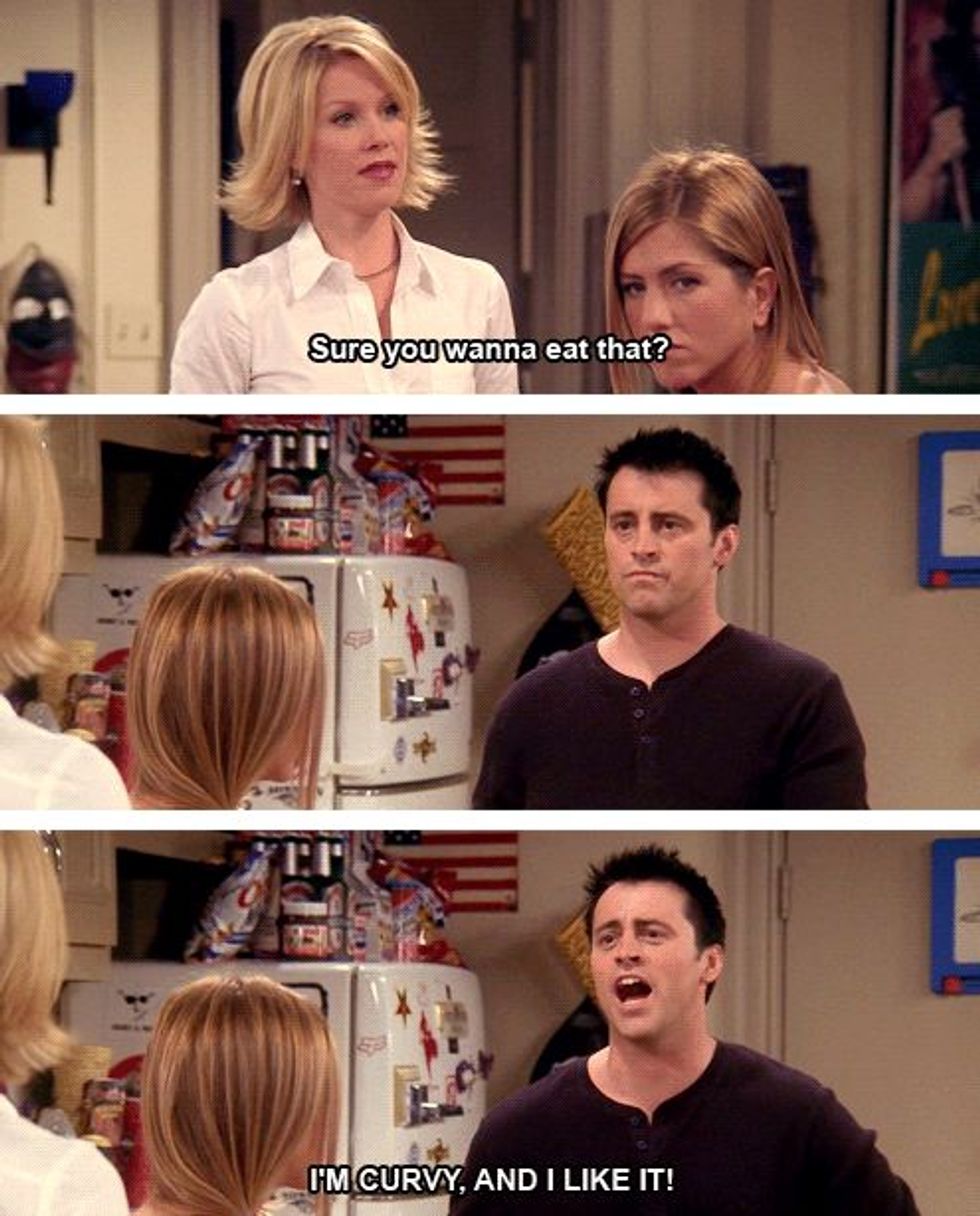 Rachel's (Jennifer Aniston) sister, Amy (Christina Applegate), keeps questioning Joey about the food he is eating, and Joey responds perfectly. He shows that no matter what body type we have, we should love ourselves for who we are.