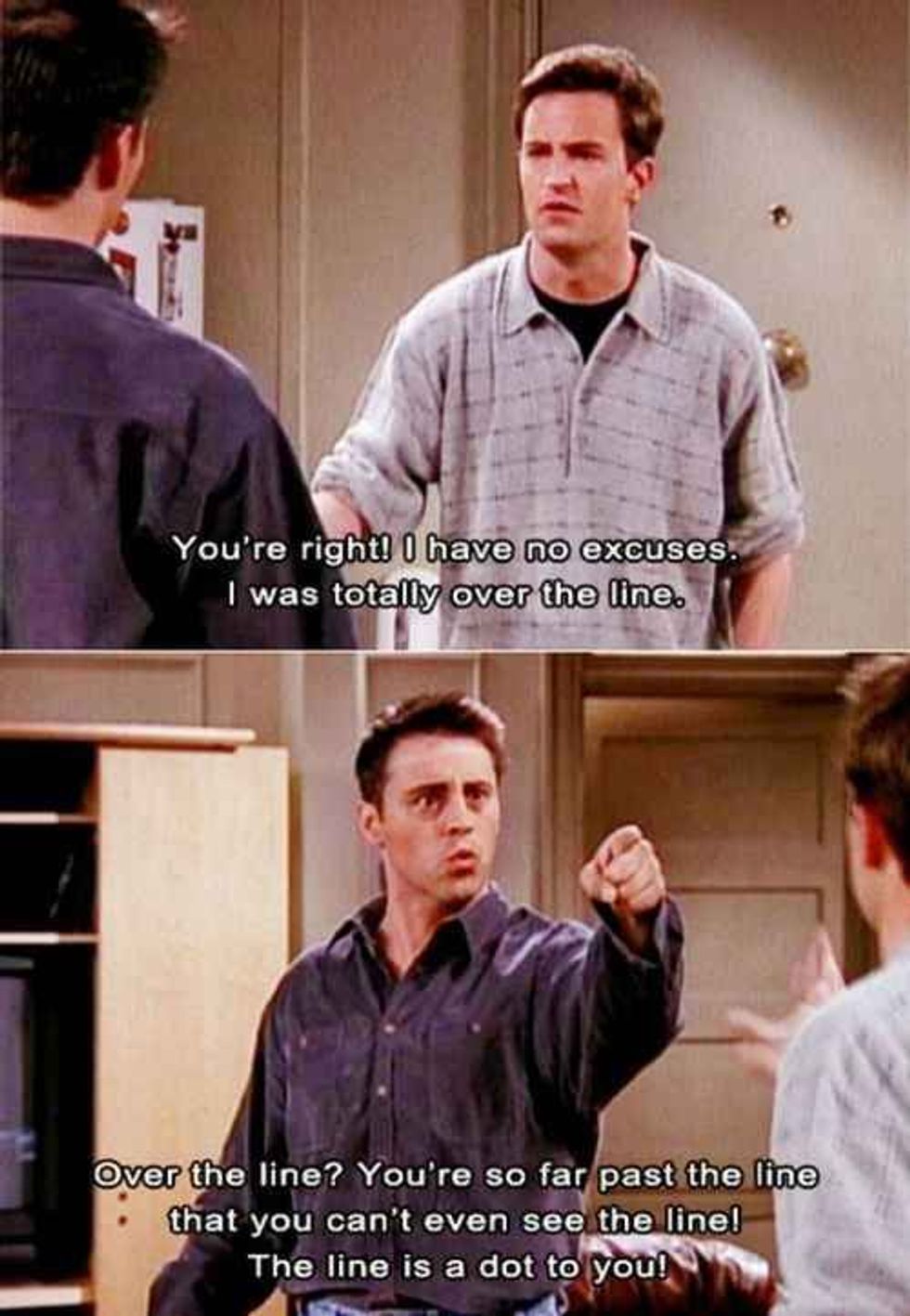 This moment was funny, despite the intensity behind it. Chandler (Matthew Perry) kissed a girl that Joey was seeing and he totally crossed the line. Joey makes a good point, saying that Chandler is WAY over the line. If Chandler had been honest with Joey in the beginning about how much he liked the girl, Joey is the kind of guy that would have just stepped aside. Honesty is what is truly important in any relationship.
