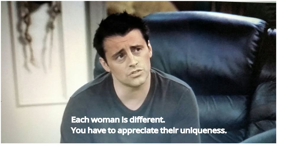 Joey dated A LOT, and he was still smart enough to realize that everyone is unique. You will never find two people that are the same. Everyone, whether they are male or female, is different in their own ways. Each person is special just the way they are, and like Joey says, we have to learn to appreciate everyone's differences, and what makes them them.