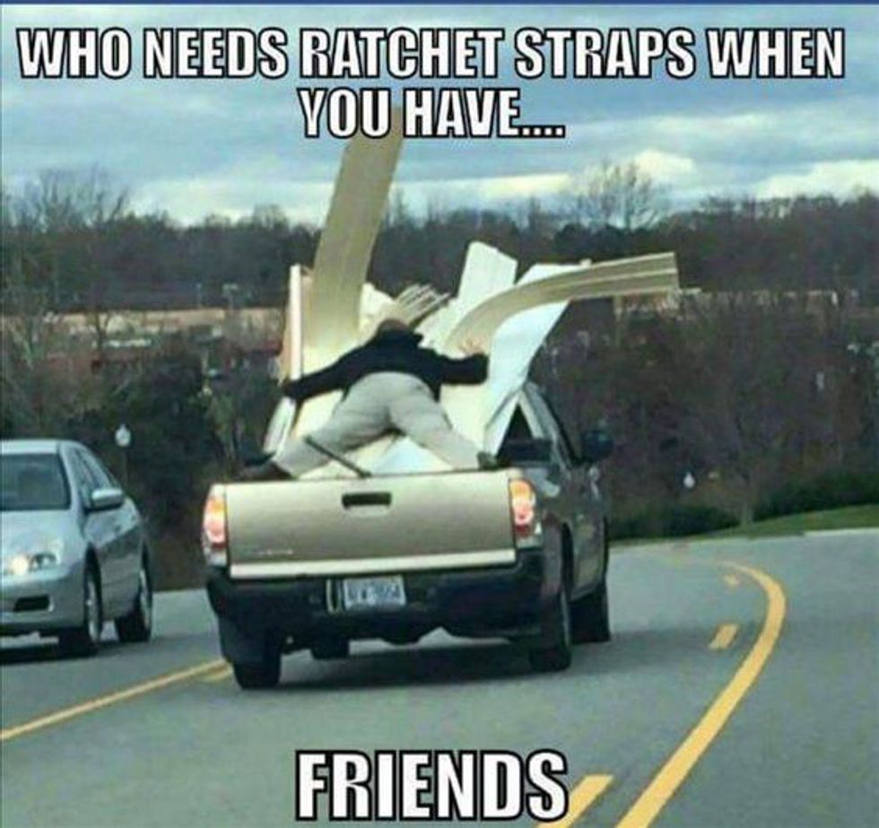 When you have to move everything to the new place you have to find some friends and family who are willing to help. You need to make sure you have everything strapped in and down and the necessary stuff to do that. And if you are moving out of state it might be one of the longest drive of your life. At this point you aren't above asking one crazy friend to do what's happening in the above mentioned picture.
