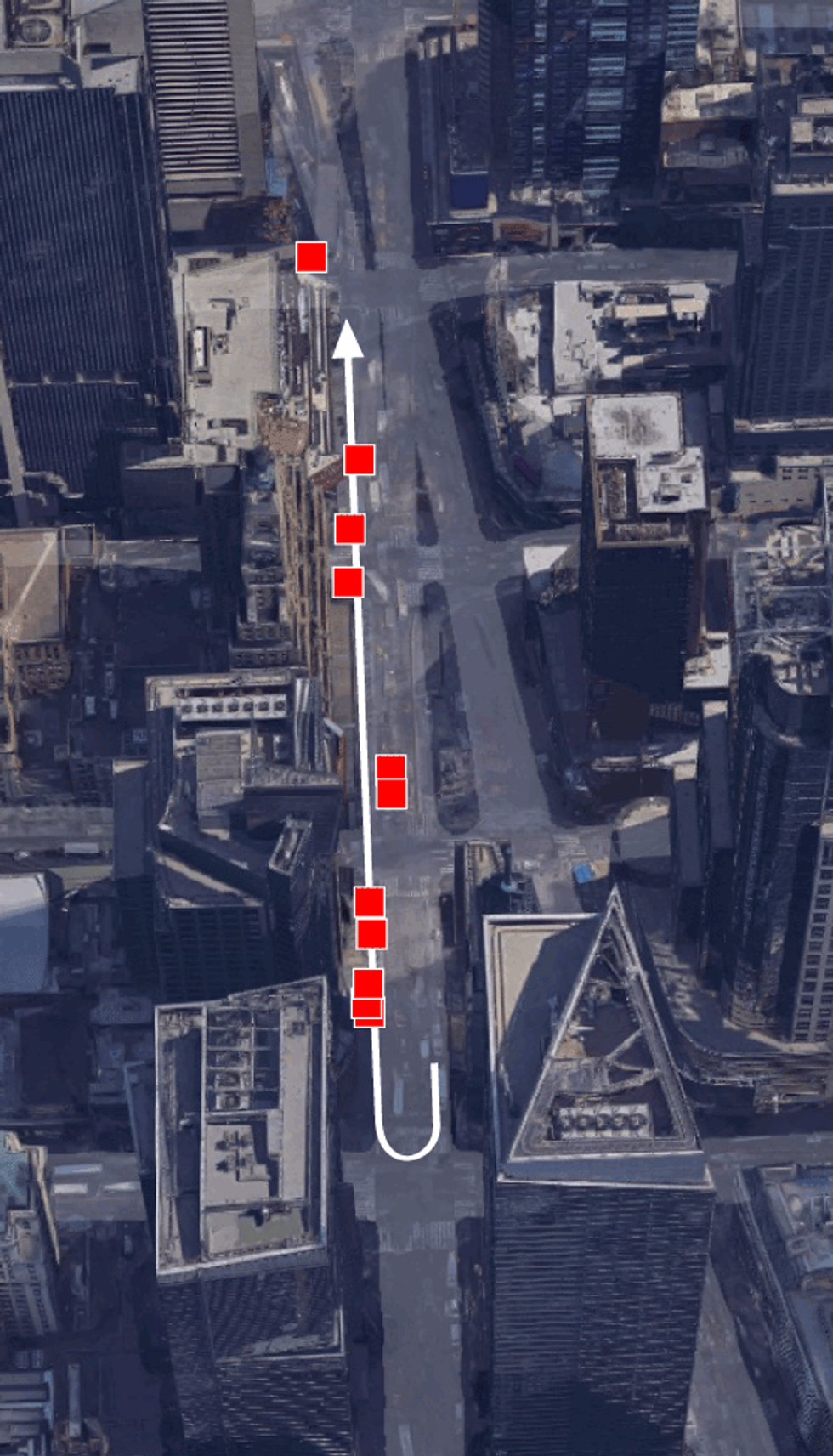 The picture below illustrates the path Rojas took, and the red squares indicate injuries of people who can be found in photos in the New York Times article "One Dead and 22 Injured as Car Rams Into Pedestrians in Times Square."