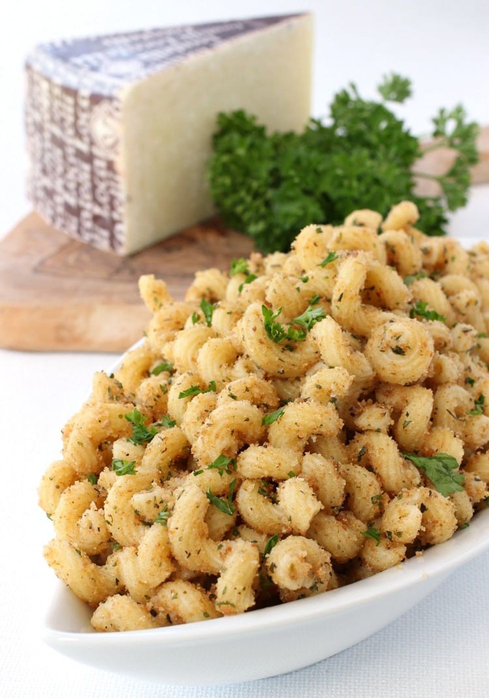 - GARLIC. If you're making a whole recipe, grate about three cloves into the cheese sauce and about three cloves into the butter for the breadcrumbs before you melt it. If you're making a half recipe, reduce this to two. Not a requirement, but so good.