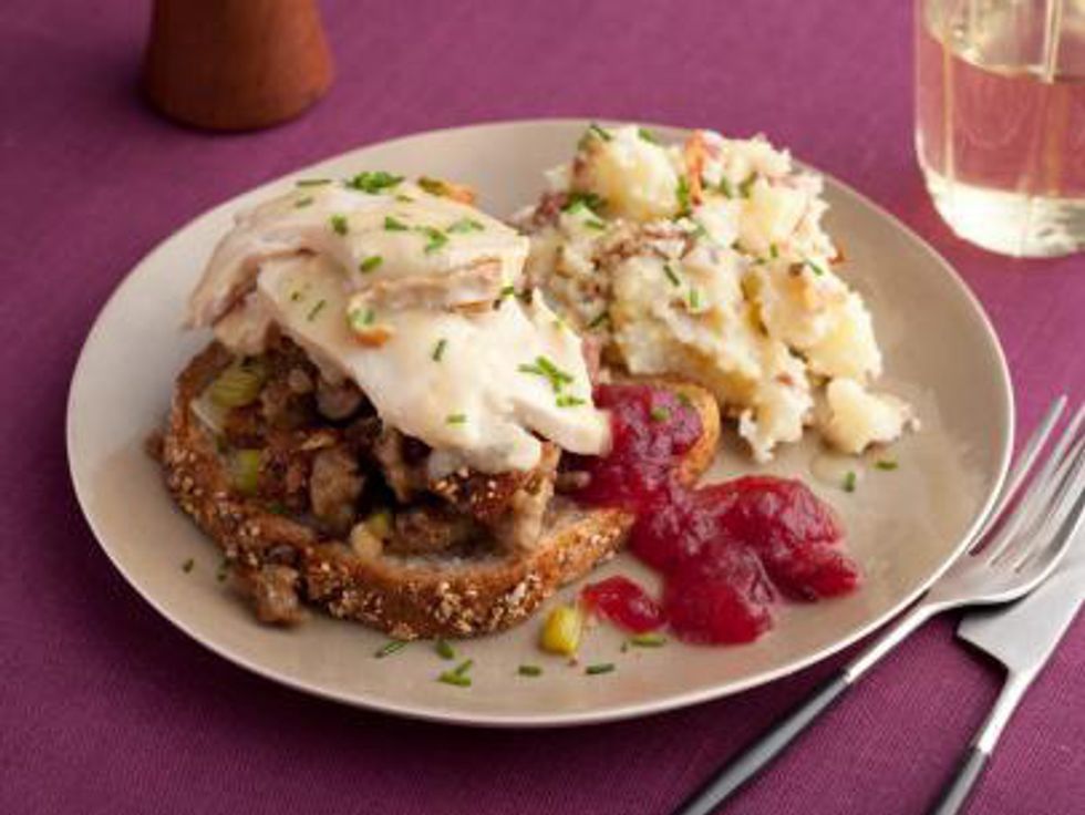 1. Open Faced Hot Turkey Sammys with Sausage Stuffing and Gravy, Smashed Potatoes with Bacon, Warm Apple-Cranberry Sauce