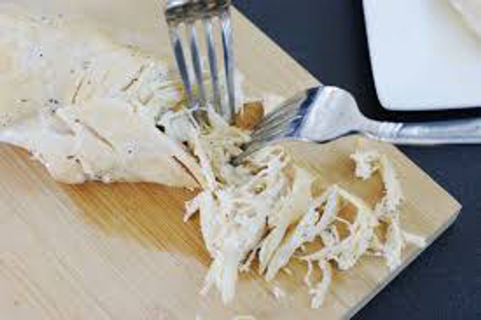 Step 2: If you have a small fridge like me it is a good idea to break down your chicken (cut your chicken into smaller pieces, i.e. breast meat, drumsticks, wings) so it fits into a container(s). Once you’ve broken the chicken down, take some chicken breast and shred with two forks to desired consistency. See image below for technique.