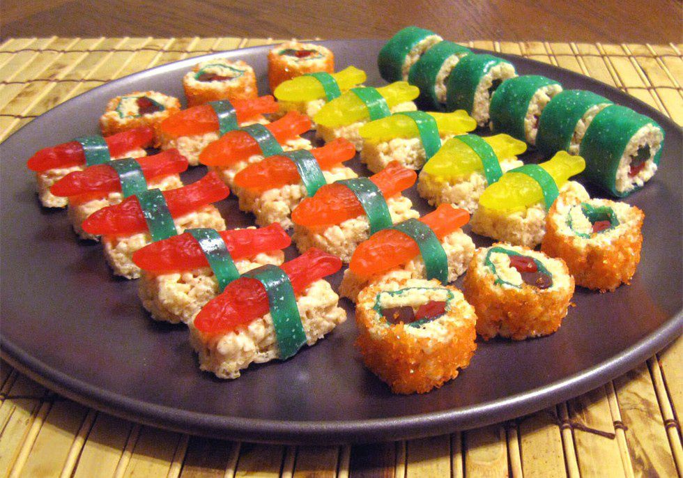 This recipe is great because it is simple and doesn't require any baking! You just need to make a pan of Rice Krispie treats, cut them into small pieces, and top with Swedish Fish or place candy inside, roll it up, and wrap in pieces of Fruit Roll-Ups. This would be a good one to make with little cousins or nieces and nephews as well! Check out the recipe here and feel free to customize it to your liking!