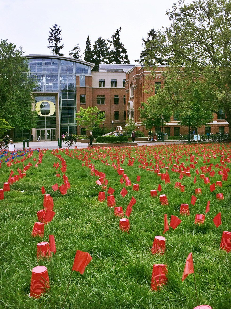 As a part of Sexual Assault Awareness month, the University of Oregon did the same public display as last year. They set up thousands of red solo cups with red flags attached to them on the front lawn of the quad. I believe the goal was to bring a reality check to people unaware of really how many people are affected by sexual assault. With my excellent estimating skills, I am guessing there were maybe 1,800 cups, maybe 2,000. Then I did some math. There are 24,125 students enrolled at the U of O, 12,672 are female. If 25% of college women face sexual assault that’s 3,168 women at the U of O who have faced or will face sexual assault. Now let’s look at the men, and the running statistic that 1 in 16 college men will face sexual assault. With 11,453 male students, that’s 714 men who have or will face sexual assault. In total, almost 4,000 students are affected by sexual assault at the U of O. That’s much higher than the amount of cups that were present. I’m not saying that the cup representation is a bad awareness tactic; in fact, I think it works really well, as it is in the center of campus and it’s kind of hard to miss 2,000 red solo cups.