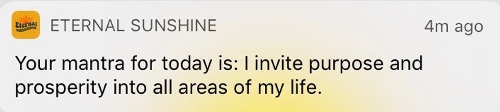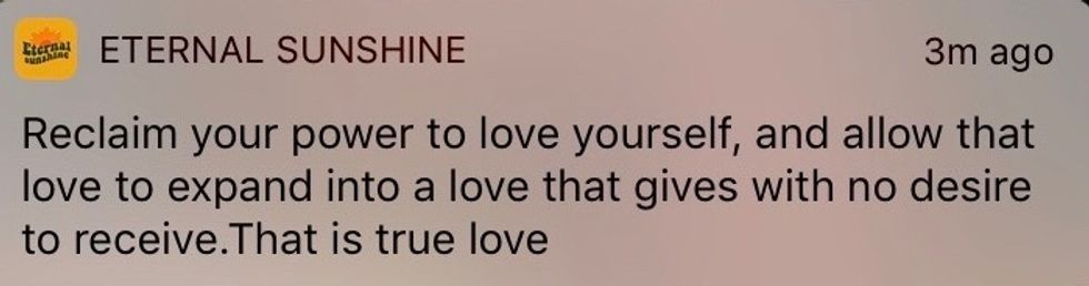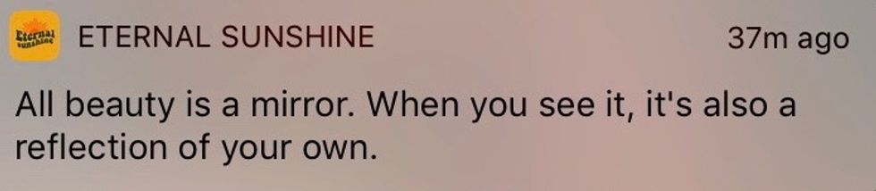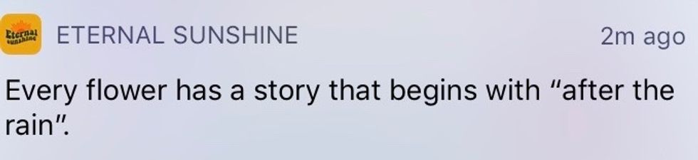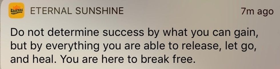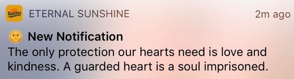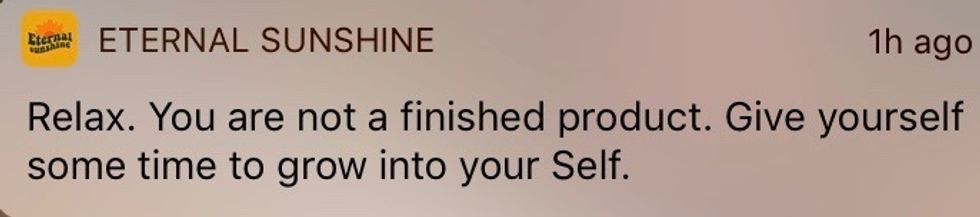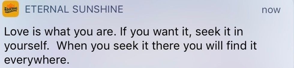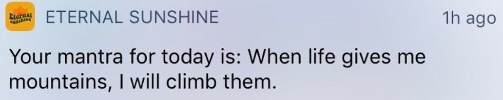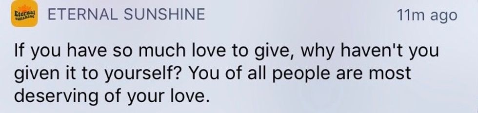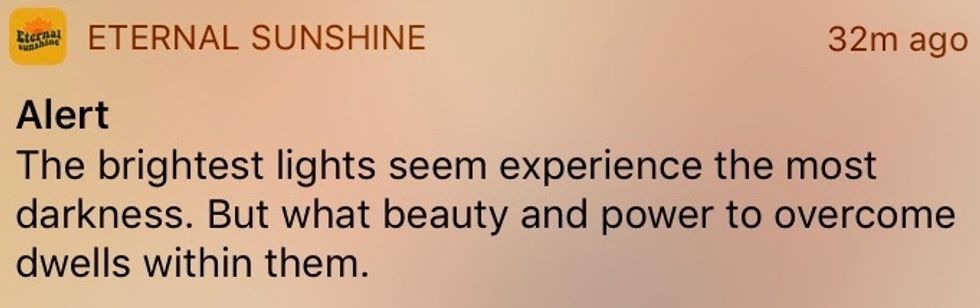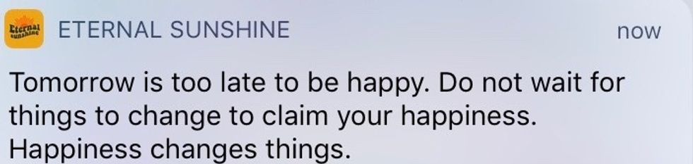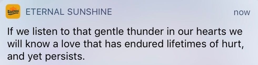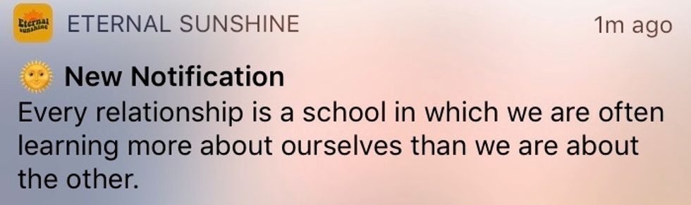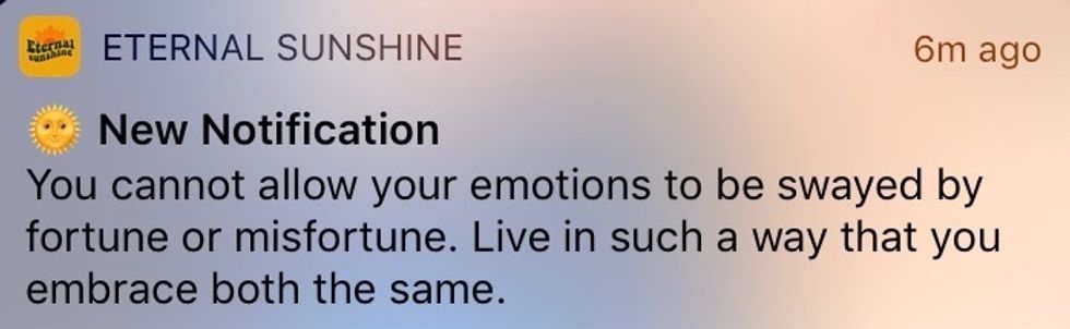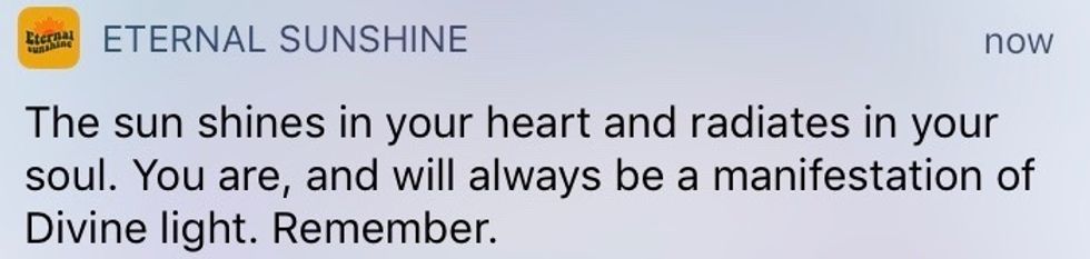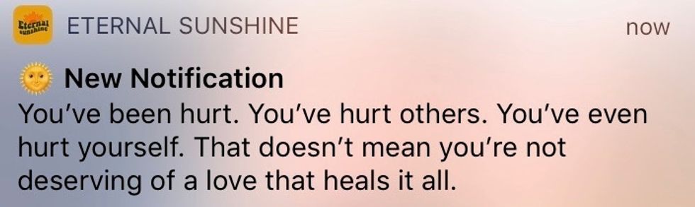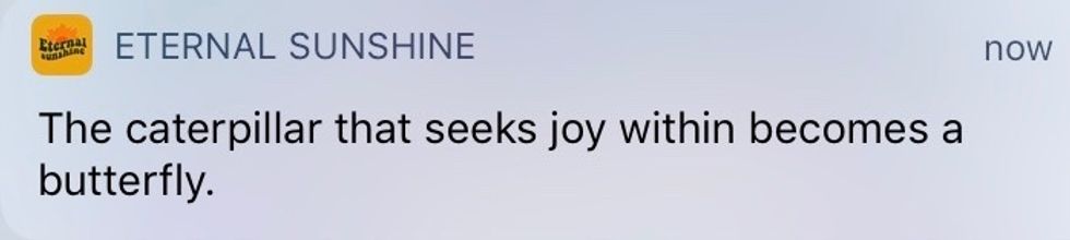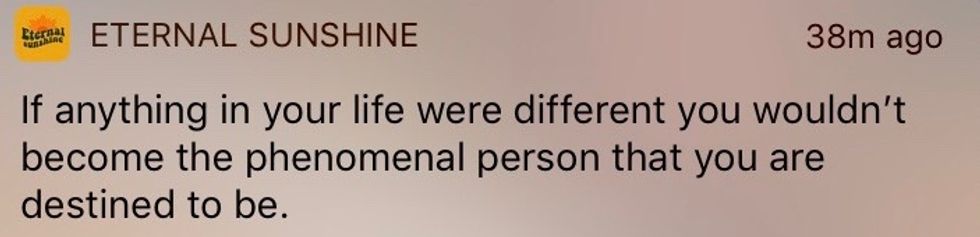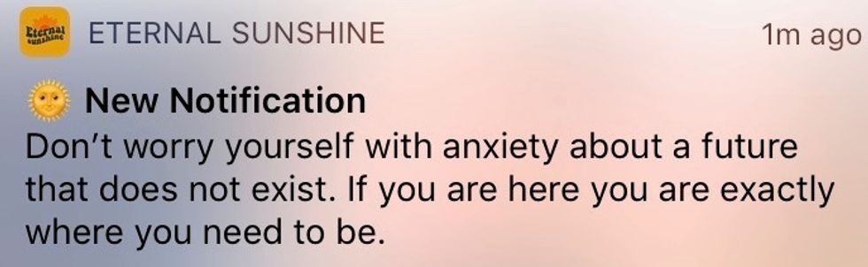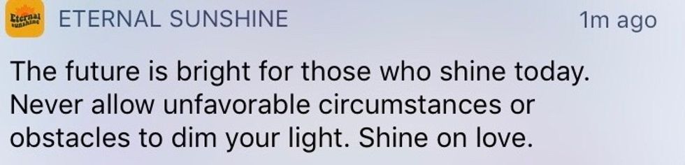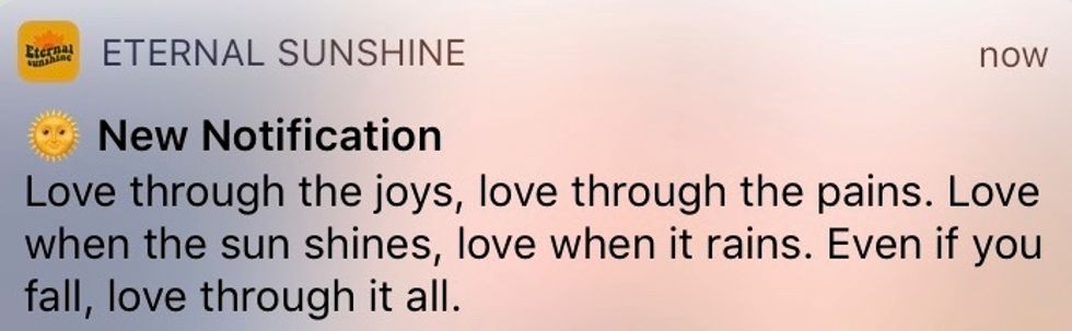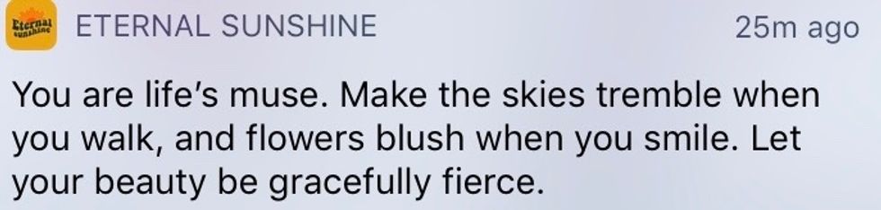 The app 'Eternal Sunshine' has helped me through every day imaginable. The ones where I couldn't stop smiling, where the sun was so bright that my skin burned with excitement, and the days where I couldn't even leave my bed from my anxiety and depression, to the days where nothing was going my way, or everything was going my way. Every day for the past six months I have gotten notifications from this app, and let me tell you, it is INCREDIBLE.