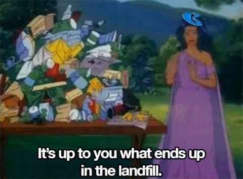 Like the kids of Captain Planet said, be wary of what you throw out. Most of what makes up someone's garbage is wasted food or scraps. When these are taken to the landfill, they can't even degrade properly because of all of the other material and products thrown out.