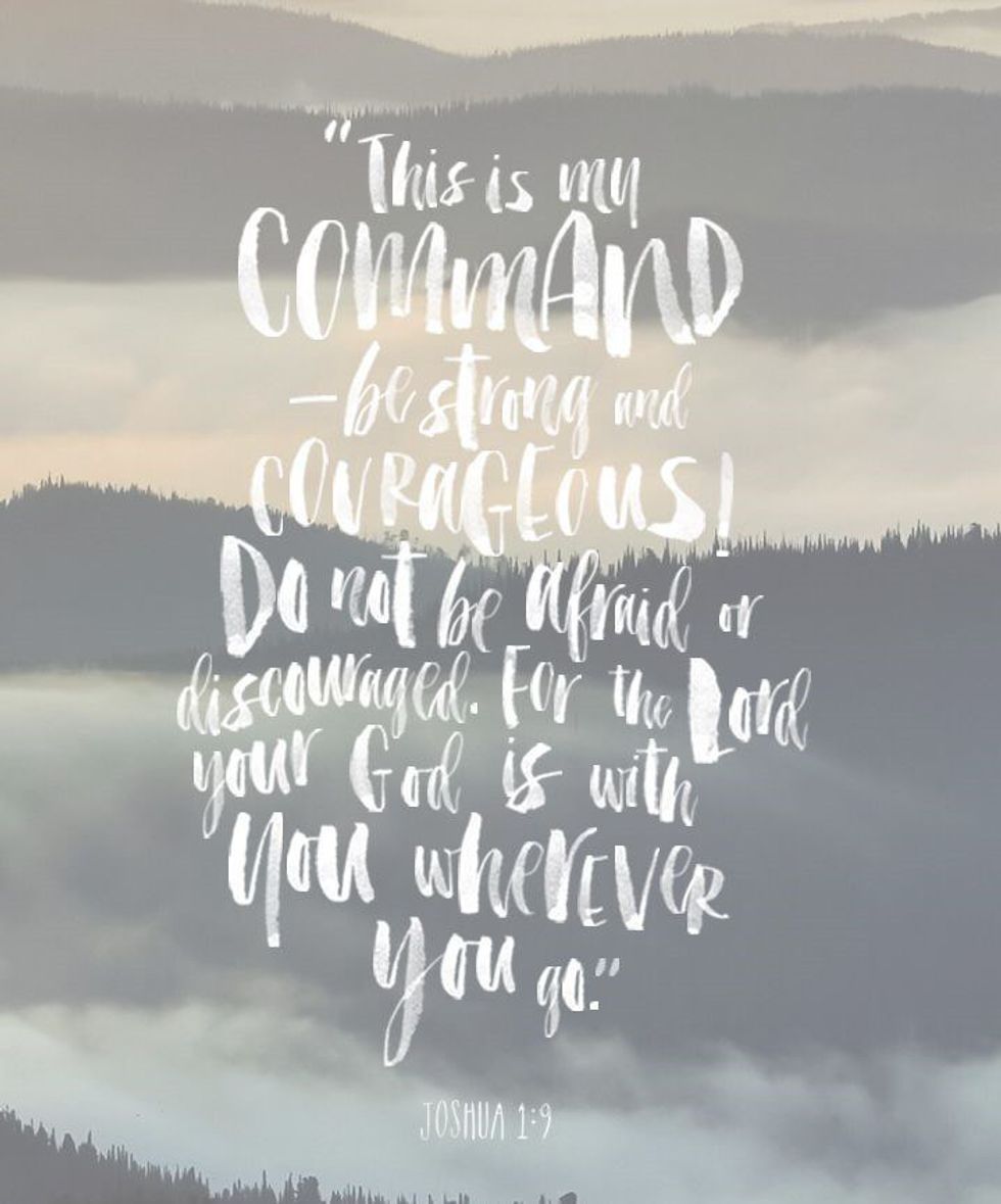 1. "Be strong and courageous. Do not be afraid; do not be discouraged. For the Lord your God will be with you wherever you go." - Joshua 1:9