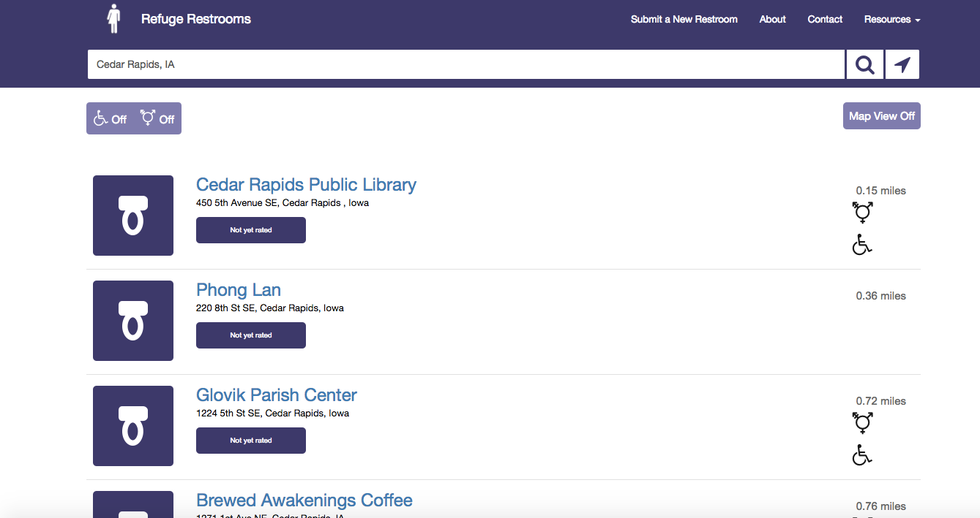 Say you want to look at safe restrooms in Cedar Rapids, Iowa. Simply type in your search in the search bar and click search.