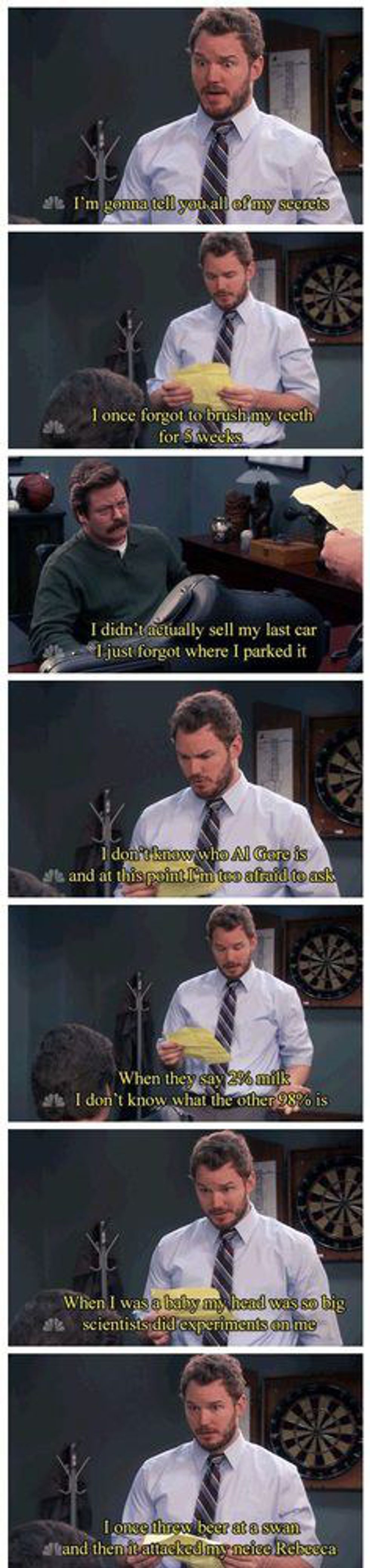 I'm not the type to tell people very personal things about myself. I was watching "Parks and Recreation" the other day (something I do probably too often as I've seen every episode multiple times), and it was the episode where Andy tells Ron a list of secrets that are all hilarious and random and, well, Andy. And I've come to realize that I have a lot of random, hilarious secrets myself that I haven't told many people. And instead of just telling someone in person, my next rational thought was to put it into an article and publish it for the world to see. So here it goes: