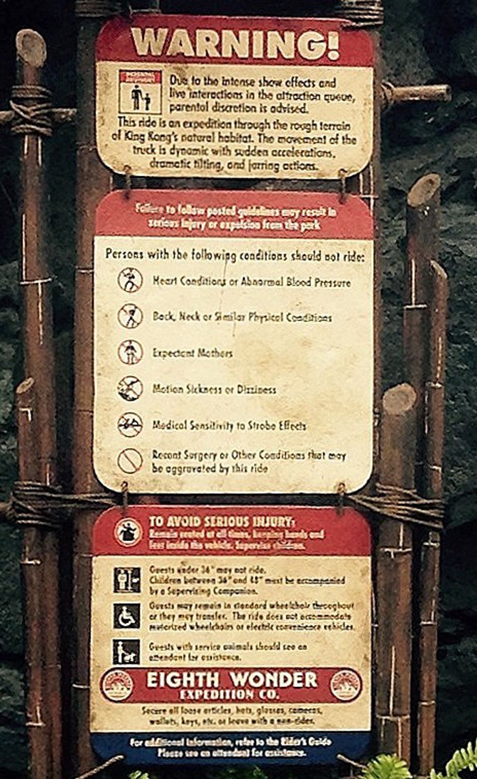 The top part literally says "Due to intense show effects and live interactions in the attraction que, parental discretion is advised."