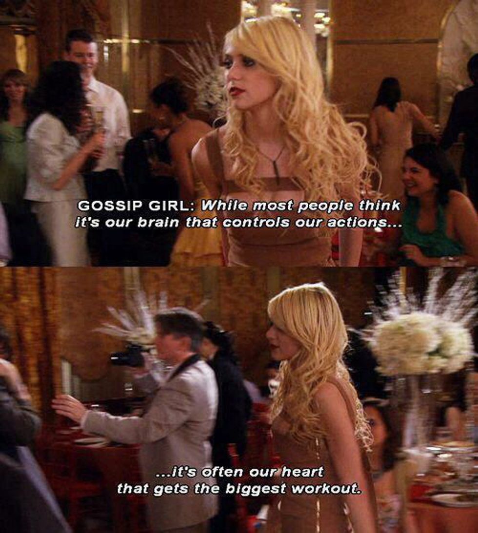 36. "Cinderella did not google prince charming." -Blair Waldorf37. "While most people think it's our brain that controls our actions, it's often our heart that gets the biggest workout." -Gossip Girl