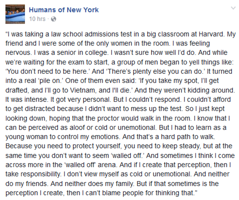 To the woman who stepped into that room to test into Harvard and to every woman out there, we need to remember that we've all dealt with this sort of sexism. We've been told we don't deserve something because we were born a woman, but we have to be great but not too great. We've walled ourselves off to protect ourselves, and we've stood tall against those that want to tear us down.