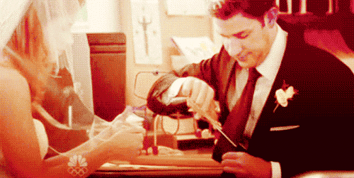 This gif displays a scene leading up to Jim and Pam's wedding, one of the most anticipated events of the entire show (which takes place in Season 4 if I remember correctly). Pam tore her veil, and was extremely upset because she wanted everything to be perfect for the occasion, as any one human being would. She asks Jim to ignore the "groom can't see the bride before the wedding" rule so she can vent her feelings. Jim responds to Pam's sadness by cutting his tie in half, as shown above, leveling the playing field. Pam proceeds to take a mental picture of Jim. The cuteness surrounding this scene is far beyond any living being's emotional capacity. Of course, it is followed up by a group dance routine: