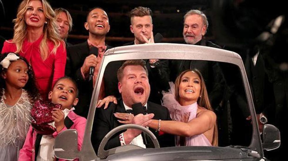 Though he may be best known as the driver in the viral Carpool Karaoke videos, the Late Late Show on CBS's host had a ton of not-so-hidden talents up his sleeve as this year's host. Corden opened the show by falling down the stairs, then preceding to flawlessly rap his opening monologue. Another highlight was a particularly special edition of Carpool Karaoke done live, featuring JLo, Faith Hill and Tim McGraw, John Legend, and Neil Diamond all singing his classic "Sweet Caroline." To top it off, Blue Ivy Carter herself ran over to join the Carpool fun.