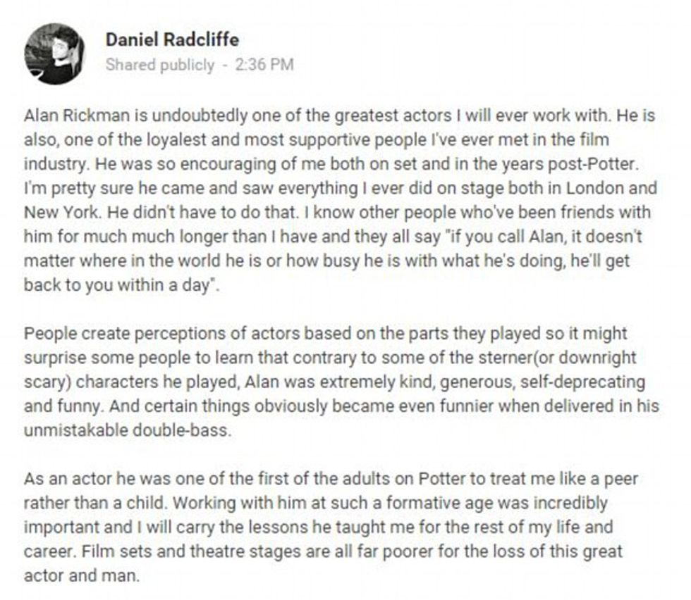 The untimely death of Rickman was due to a short battle with cancer. He passed away at the age of 69. After his death, fellow witches and wizards took to social media to express their memorial of Severus Snape and the great actor that portrayed him for ten years.