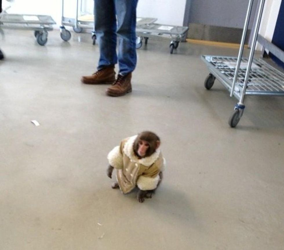 On December 9, 2012, in Toronto, a small monkey was spotted wandering around Swedish furniture store IKEA. As if this was not strange enough, the monkey was wearing a fitted shearling coat—a cute one, at that.