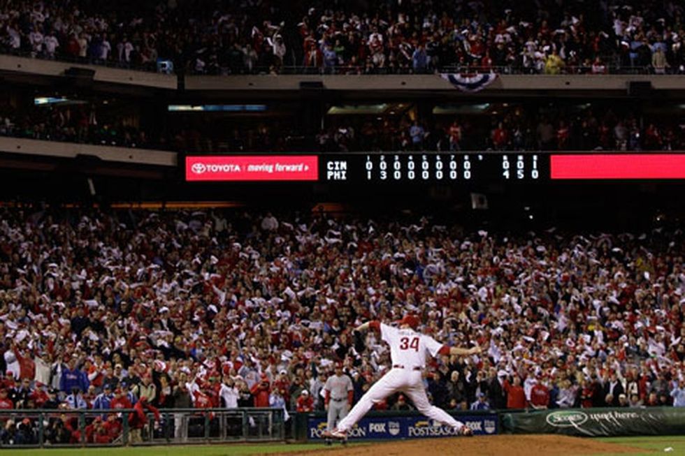 An iconic shot of Halladay before completing his famous No-Hitter in the 2010 NLDS.
