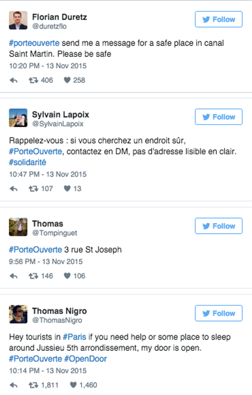 Take the Paris attacks. People all over the city started a campaign on Twitter, #PorteOuverte, generously offering people places to sleep and stay who could not get back to their homes.