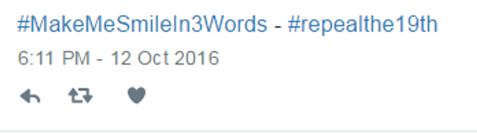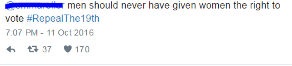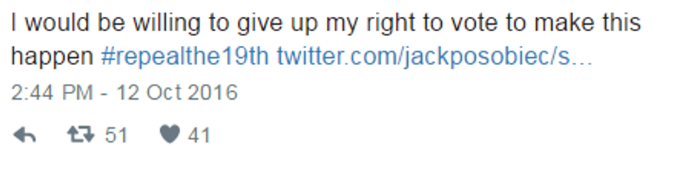 And what disturbs me most about this inhumane hashtag is that women are supporting it, such as the examples shown below. I don’t know about my fellow ladies, but I love being able to have a voice in my country. I’ve watched both debates, obnoxious as they were; I’m registered to vote this coming November. I don’t have a clue why I would want that stripped away from me. Women have a voice; we deserve to be heard. Men definitely did not “give us” the right to vote, it was a feature of life not granted to us until we fought for it.