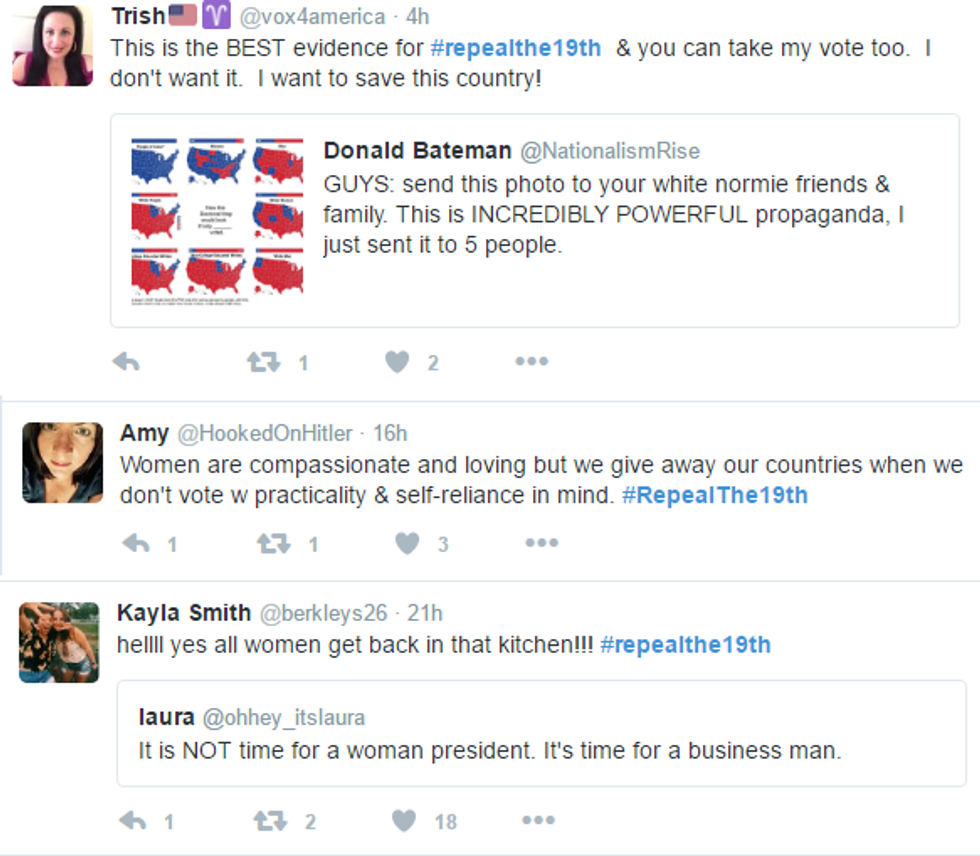 Remember, I said it was started by trolls but for the most part it's not the trolls that have given it a rise in popularity. I have been watching the hashtag for a couple days now and majority of the tweets that I have seen are not the trolls. The majority of the tweets are women who are providing reasons why it should not happen and expressing their anger over the fact that it was said but also insulting those that said it. The Washington Post also recently wrote an article that supports this. There are, of course, #RepealThe19th tweets that are genuine (as well as the trolls) and one of the most disturbing thing about that is, it's not just men.
