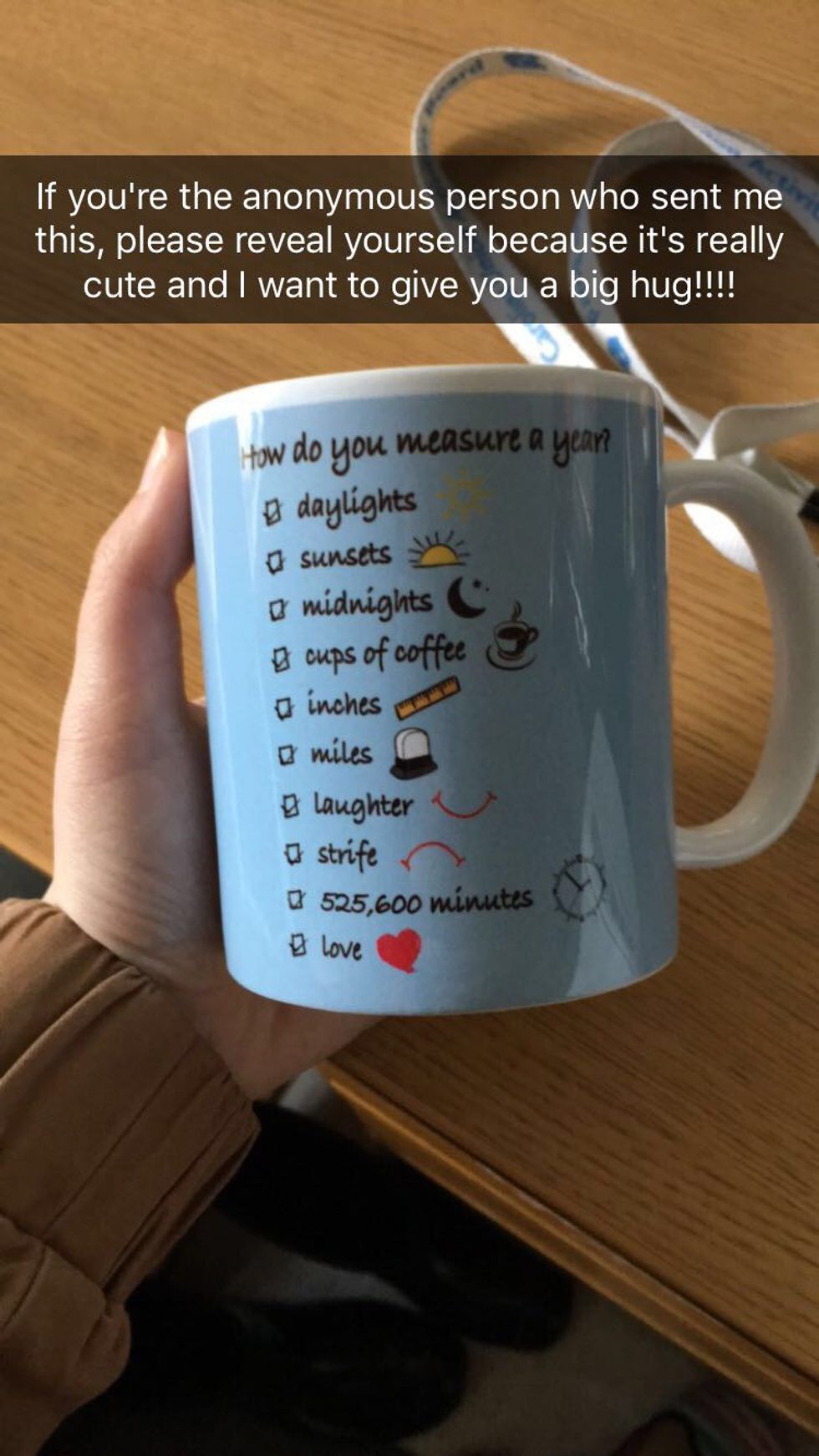 I peeked inside and saw a handle. I grabbed the handle and took out a mug with an adorable print on it -- a quote from "Seasons of Love" (RENT) that says, "How do you measure a year?" I'm obsessed with it.