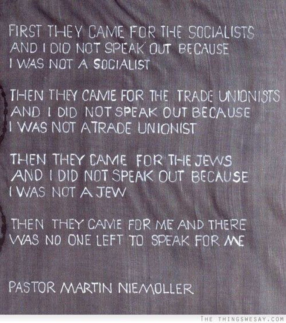 When I learned you were actually serious about running for president, I laughed. My laughter has stopped, however. It stopped when you proposed to ban Muslims from entering the United States. Maybe you forgot, but we are a nation made of Immigrants. If you were president during the Irish potato famine, would you have let my starving Catholic family into the port or sent us home to die? After all, public opinion of the Irish was not favorable. If you were president back then, I doubt either of our families would have made it off the boats. By definition Mr. Trump, you are discriminating based on religion, and thereby breaking the constitution. In the words of House Speaker Rand Paul, "This is beyond conservatism. This is not what this party stands for". Bigotry and xenophobia are not the values our brave citizens in uniform fight for. You also stayed silent when a peaceful Muslim woman was escorted from your rally. That moment as you, for once, stood quietly and watched the women being taken away by security, reminded me of a famous quote by Pastor Martin Niemoller.