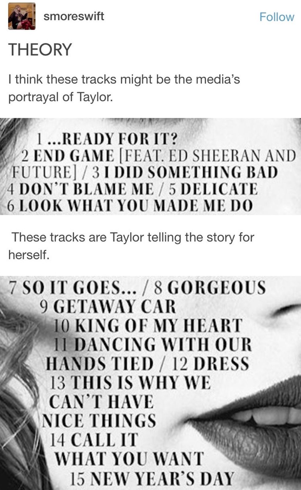 These two songs close out the album beautifully by acknowledging that Alwyn was the one who helped Taylor through her rough time despite what the media said about her and him. Call It What You Want's swoon worthy lyrics like " I want to wear his initial on a chain round my neck, Not because he owns me, But 'cause he really knows me " make this a beautiful ode to her current lover, and the entirety of New Year's Day speaks for itself.
