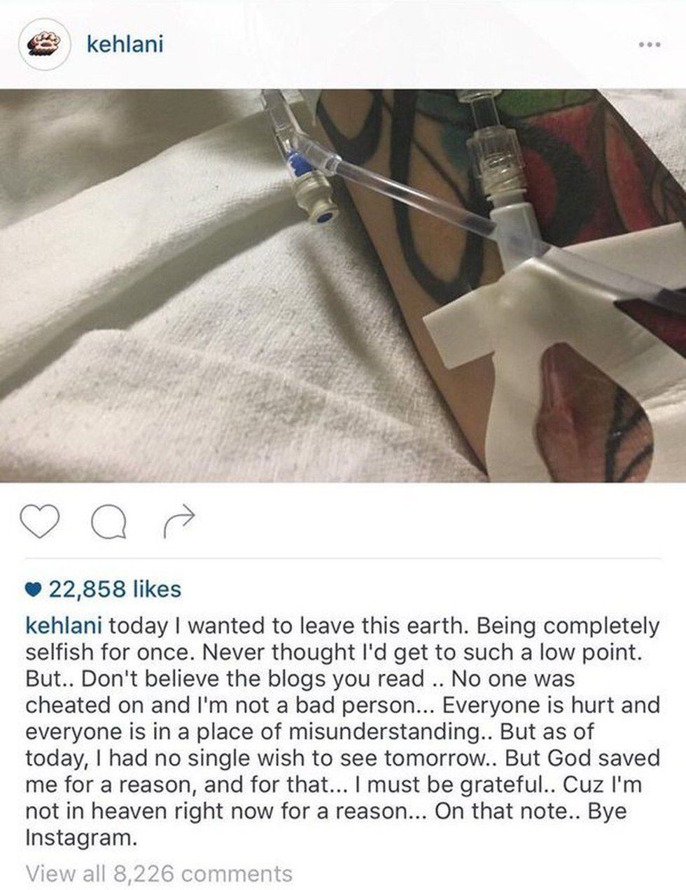 Regardless, if you do feel like Kehlani was guilty of what she did or not, she still tried to kill herself. You know Chris Brown offered his unwanted opinion, but he was right about one thing. Kehlani needed the attention from people so she could receive love and support in this time of need. Suicide is not an easy joke, and the people who are thinking about it should be taken care of. They do not deserve to be wrapped up in their heads, believing that they should not exist anymore. I know that society sometimes places celebrities at a higher standard because they have to portray that they have a so-called perfect life. But in the end, they are just humans like us, and they are going to make mistakes. Also, if you make comments about a certain celebrity, just give positive feedback, instead of the rude negative comments they receive on a regular basis because it will just decrease the amount of judgment. Like the saying goes, " if you don't have anything nice to say, don't say anything at all." So here also lie my further respect to Kehlani and her physical and mental health.
