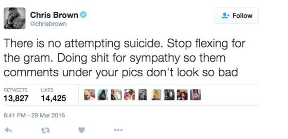 Between all of the rumors, people went straight into slut-shaming her and holding Kehlani up to a higher standard. People were tearing her apart and she ended up crashing. Even some celebrities decided to join in and demonstrate their immaturity. It is saddening how yet again, Chris Brown reaches into his misogynist pocket and blames women for everything. He continues to attack women physically and psychologically, and yes, I am going as far as when it was reported that he abused Rihanna. But, this time, it was different because many of his fans called him out on the insensitive tweet about Kehlani. I know that people are allowed to voice their opinions, but is it VERY wrong when it is such a difficult subject like suicide.