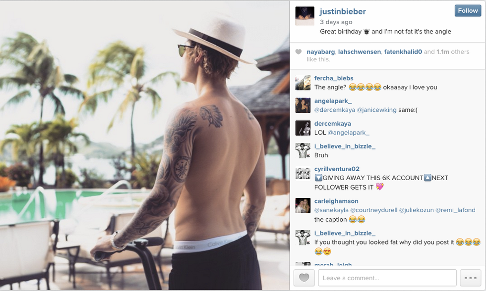 First of all Mr.Bieber, you look a little soft, but fat? LOL. Second of all, I'm glad you cleared it up to your 23.5 million followers that you are not fat because it's super important that we all know you are not overweight. Third of all, thank you for the caption because I, along with people around the nation, will be using this caption in the future, so thank you and goodnight.