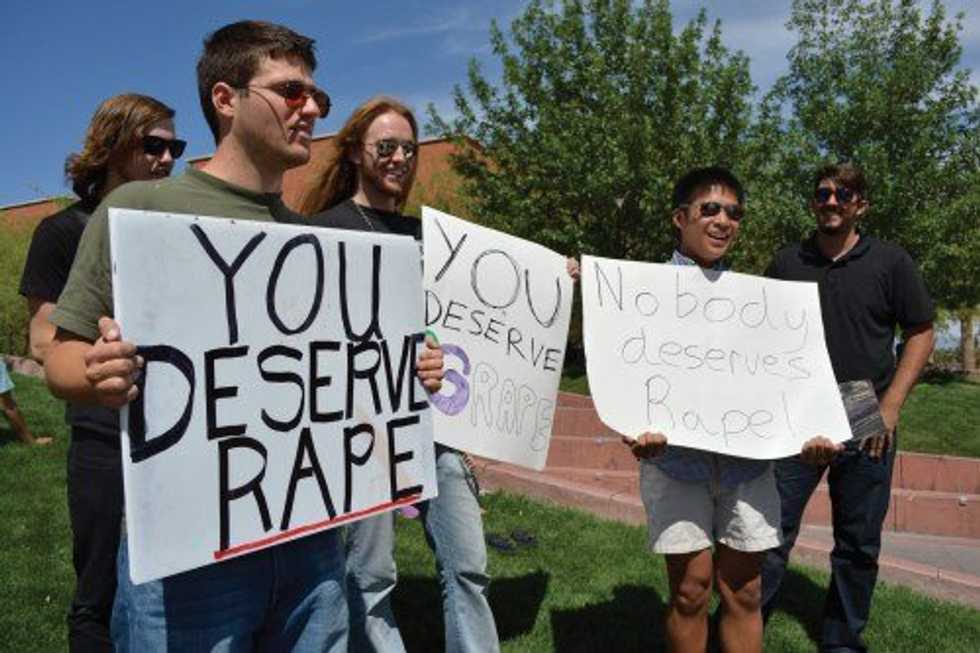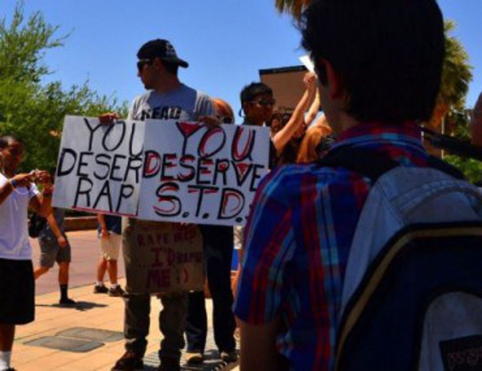 “You deserve rape”, your sign read. You call yourself "Brother Dean" and apparently you have advocated extreme viewpoints like this often for the past few years at the University of Arizona