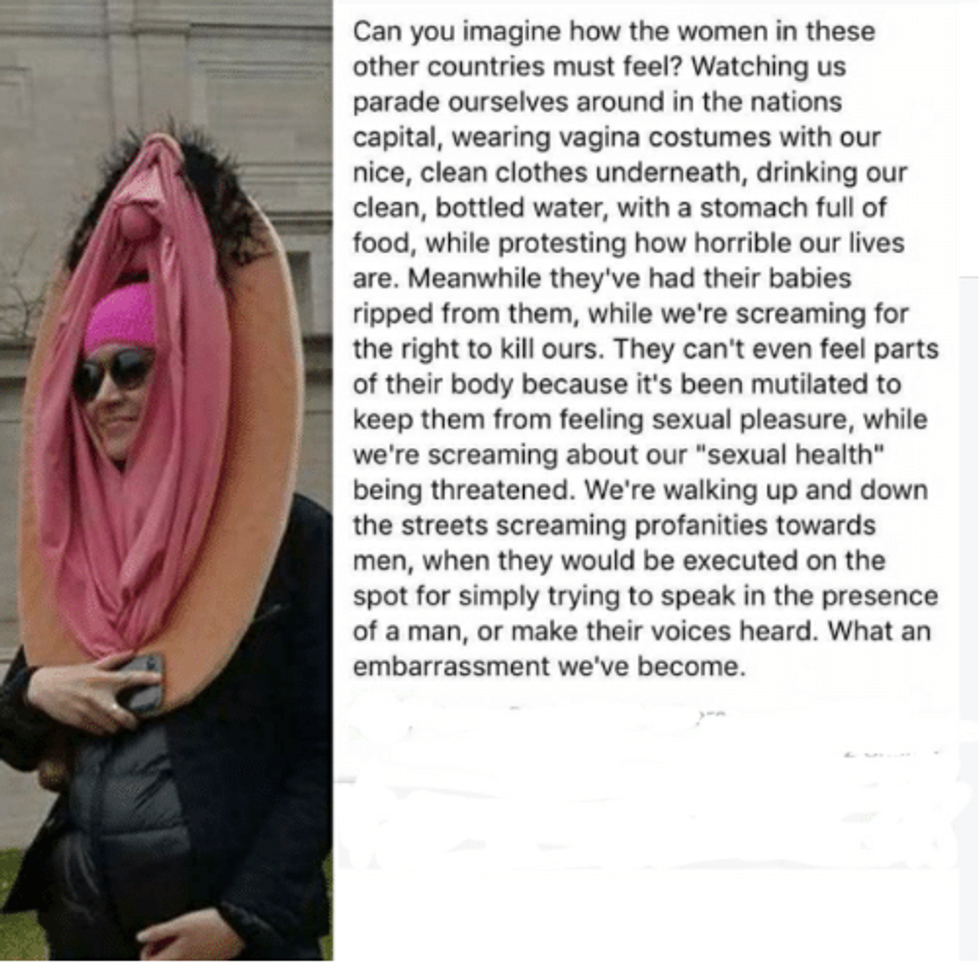 Following the 2017 Women's March that took place on Saturday, January 21, a post commenting on a woman wearing a vagina costume on her head circulated on Twitter, Facebook and other social medias. The post, seen below, compares the current state of women's rights in the United States to that of other countries, ultimately leading to the conclusion that women in America protesting for their rights should be embarrassed, because there are women who are worse off.